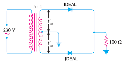 In the centre-tap circuit shown in Fig. the diodes are assumed to be idealĀ i.e. having zero internal resistance. Find :(i) d.c. output voltage(ii) peak inverse voltage (iii) rectification efficiency.