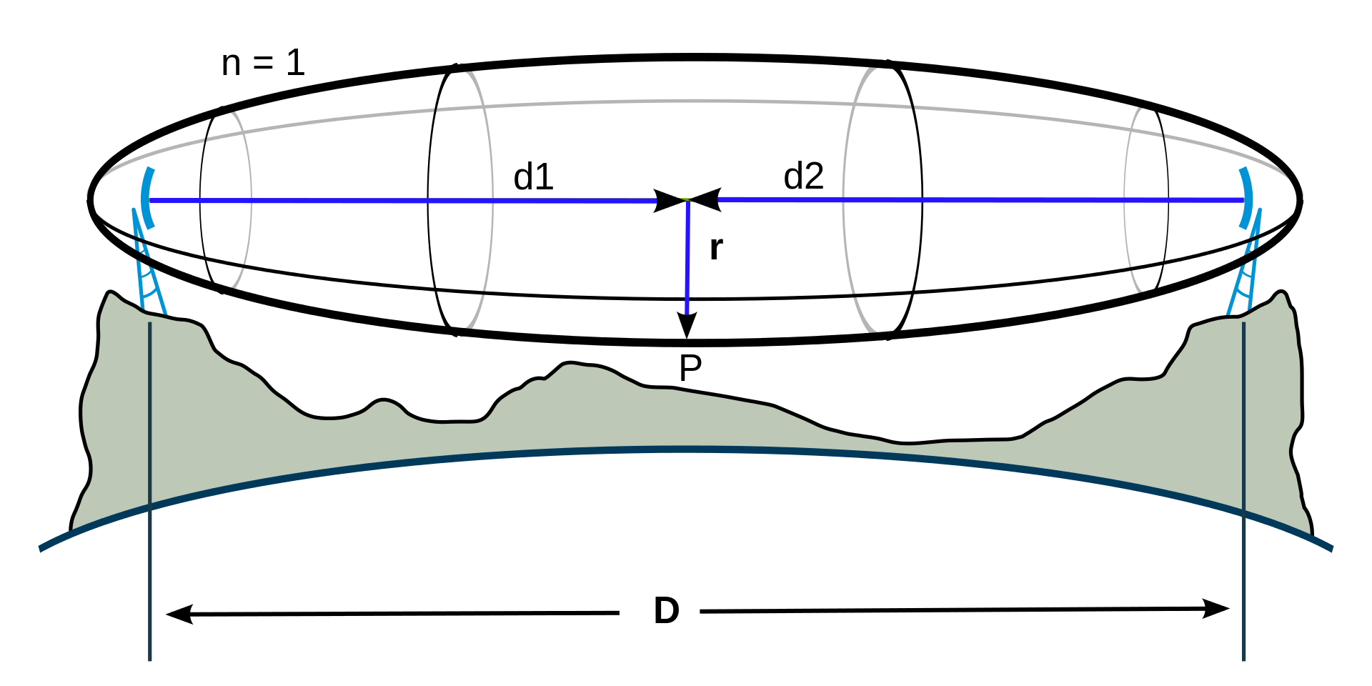 In optics, is one of a series of confocal prolate ellipsoidal regions of space between and around a transmitter and a receiver.