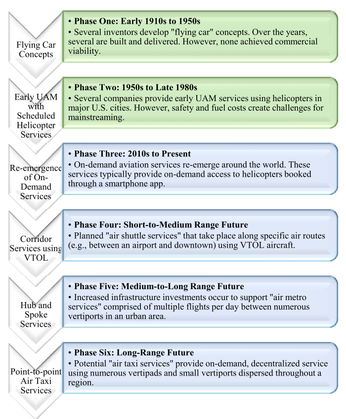 The concept of urban aviation is not new. Beginning in the early 1900s, inventors began developing “flying car” concepts and by the mid-20th century, early operators began offering scheduled flights using helicopters. The history of UAM's might be described in the two initial phases.