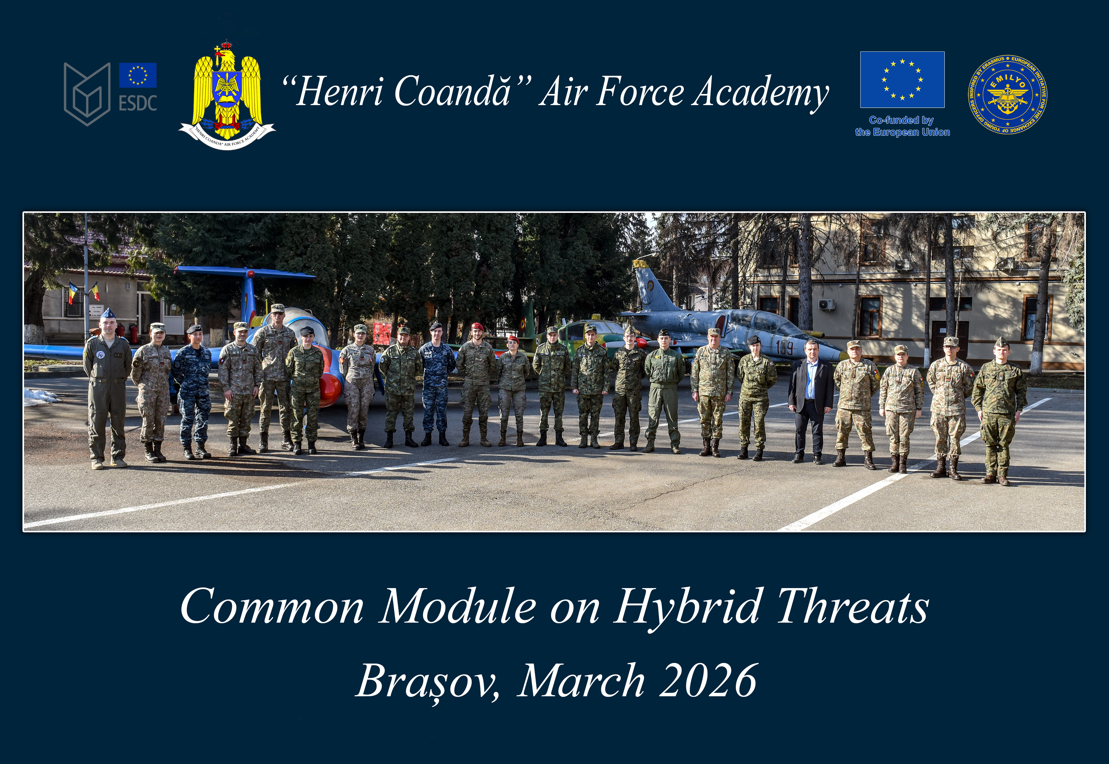 Luni, 16 martie 2026, comandantul/ rectorul Academiei Forțelor Aerienme „Henri Coandă”, gl.fl.aer. conf.univ.dr. Marius Șerbeszki, a deschis Modulul Comun „Amenințări hibride”, organizat în cadrul Liniei (omonime) de dezvoltare LoD-21 a Grupului de Implementare (IG) al Inițiativei Europene pentru Schimbul Tinerilor Ofițeri Militari (EMILYO) și a Colegiului European pentru Securitate și Apărare de la Bruxelles.